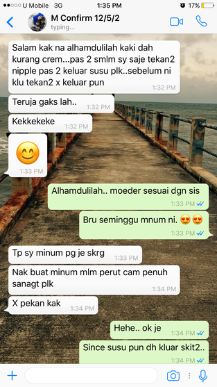 Trme ksh kak dh recommend susu Moeder dkt yatie, tak sangka minum Moeder hanya 3 hari dh nmpk effect dia. Hari kedua tu dada saya rasa bengkak je, susu tak de bnyk sgt. Bila masuk hari ke tiga. Saya bangun pagi baju sya mmg basah, suami igtkn air apa yg lh yg bsah bnyk mcm tu. Pg tu nk prgi kje sya pam smpai dpt 6oz, tak pernah lg sya dpt bnyk tu. No akaun akak still sama lg kan? Saya nk bank in duit nti, nk order dua terus. Satu jar x ckup, rase dia sdap sgt. –